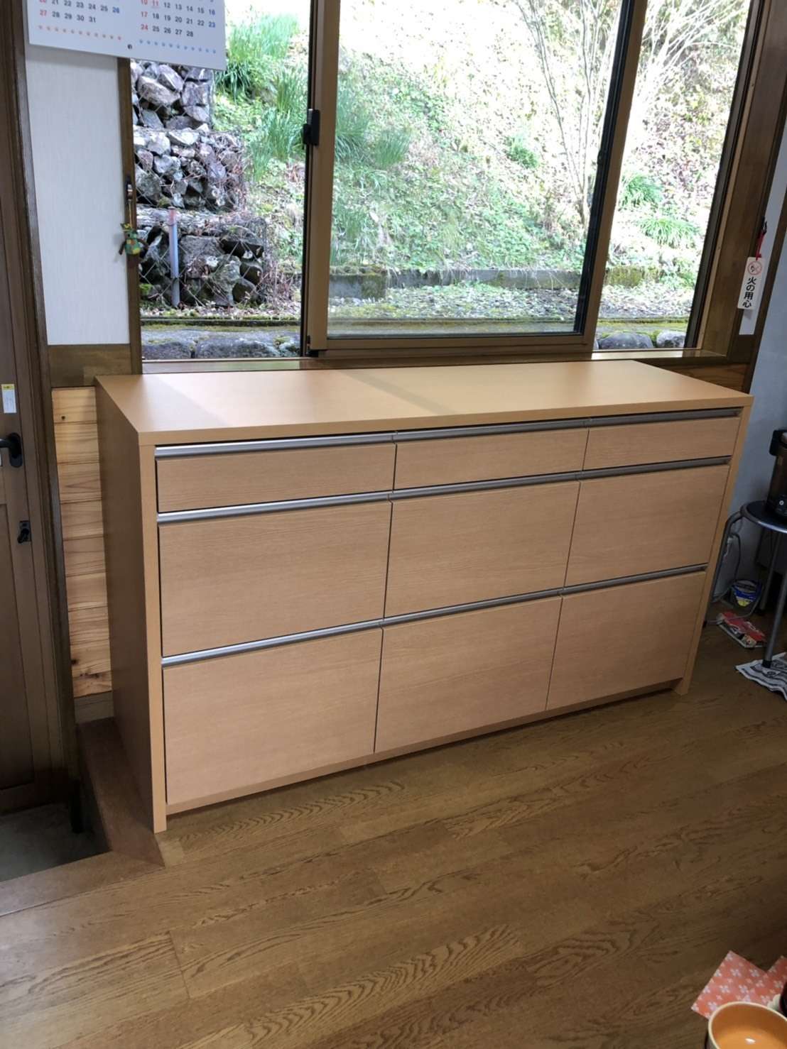 施主様より、以前既製品のストッカーを購入されてましたがこの度もっと容量の大きいものとまた色合いもその横にある既製品水屋より少しだけ濃いめのものを選んで室内が少しでも明るいものに致しました。また高さも窓台に合わせてフラットになるように製作を致しました。取手部分は既製家具のものがよいとのことで合わせて取付致しました。食器を入れるのでかなり重くなっても丈夫にスライドレールも3段引の耐荷重考慮して仕込んでおります。しっかりしたものを造って頂いたとお言葉頂きました。