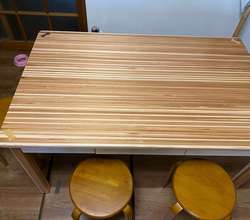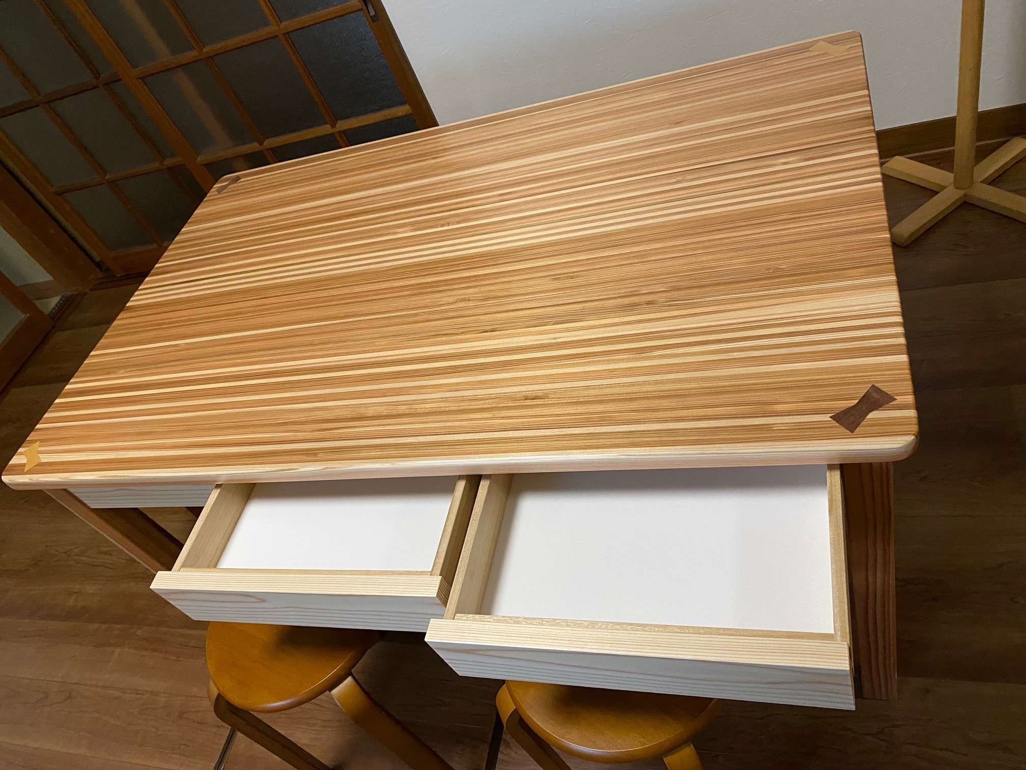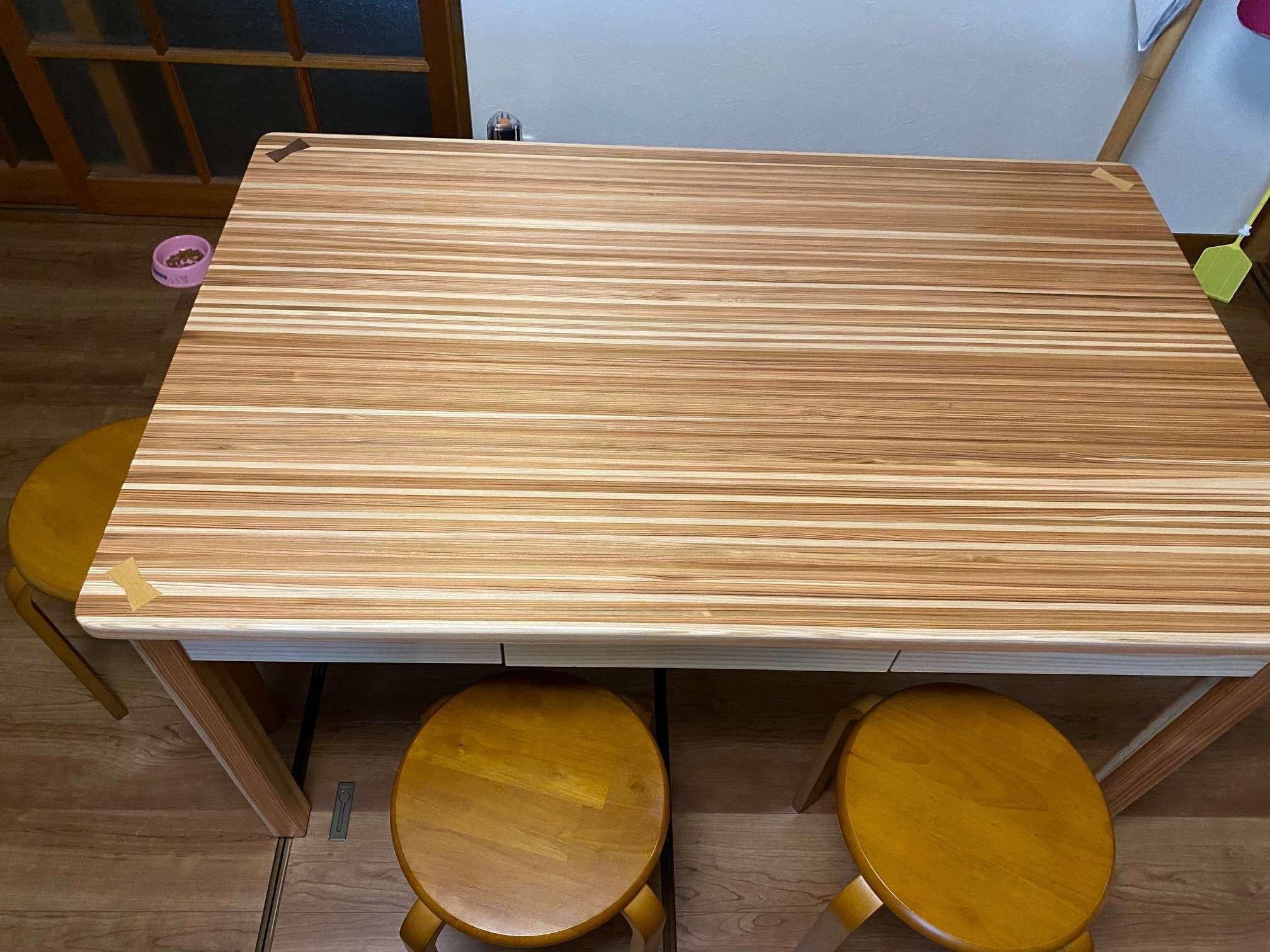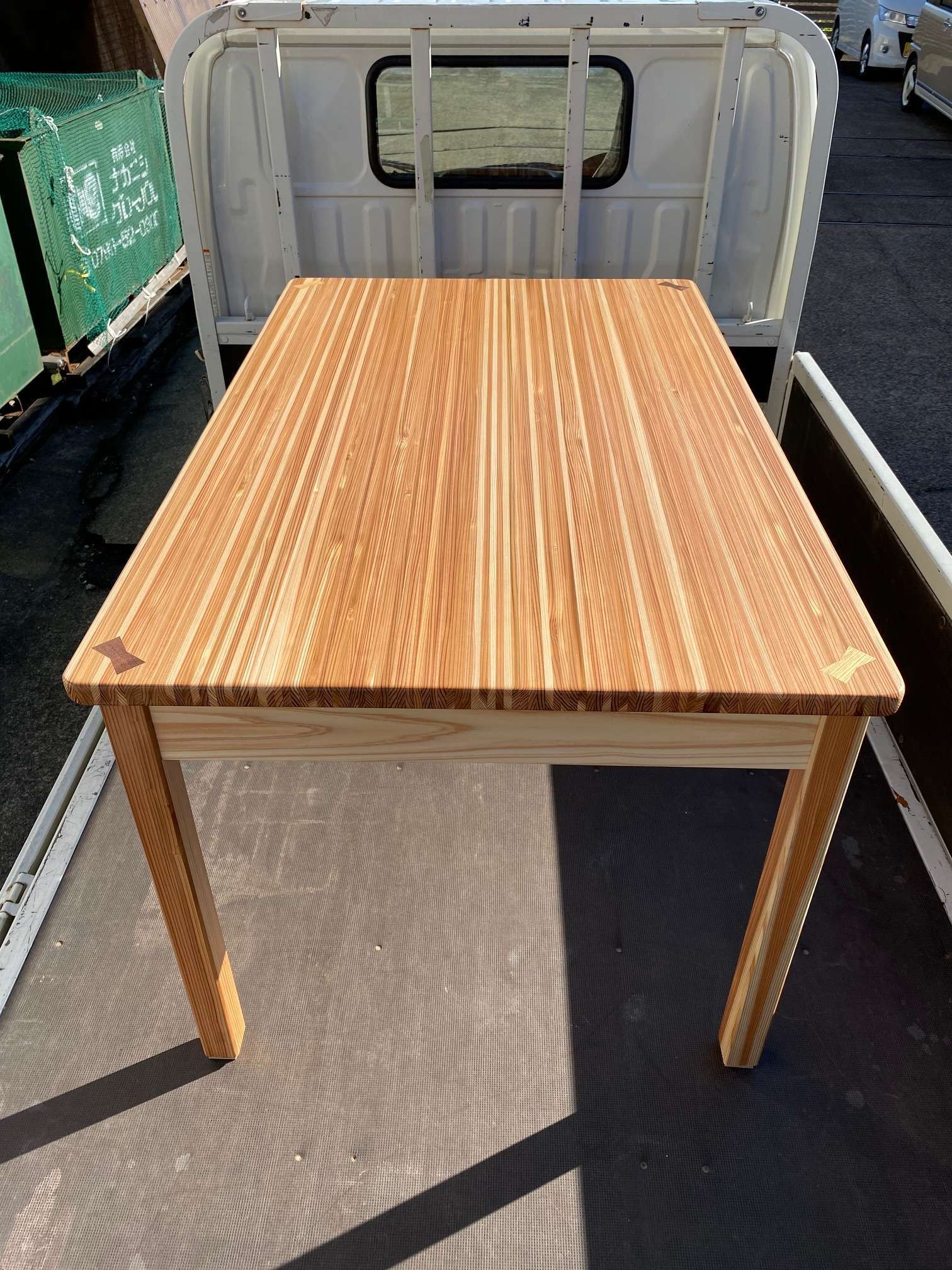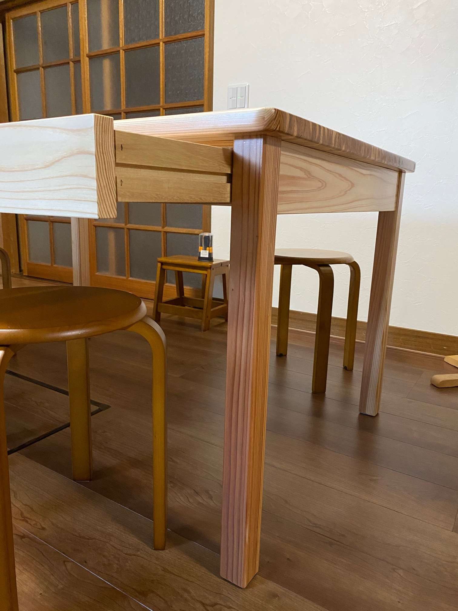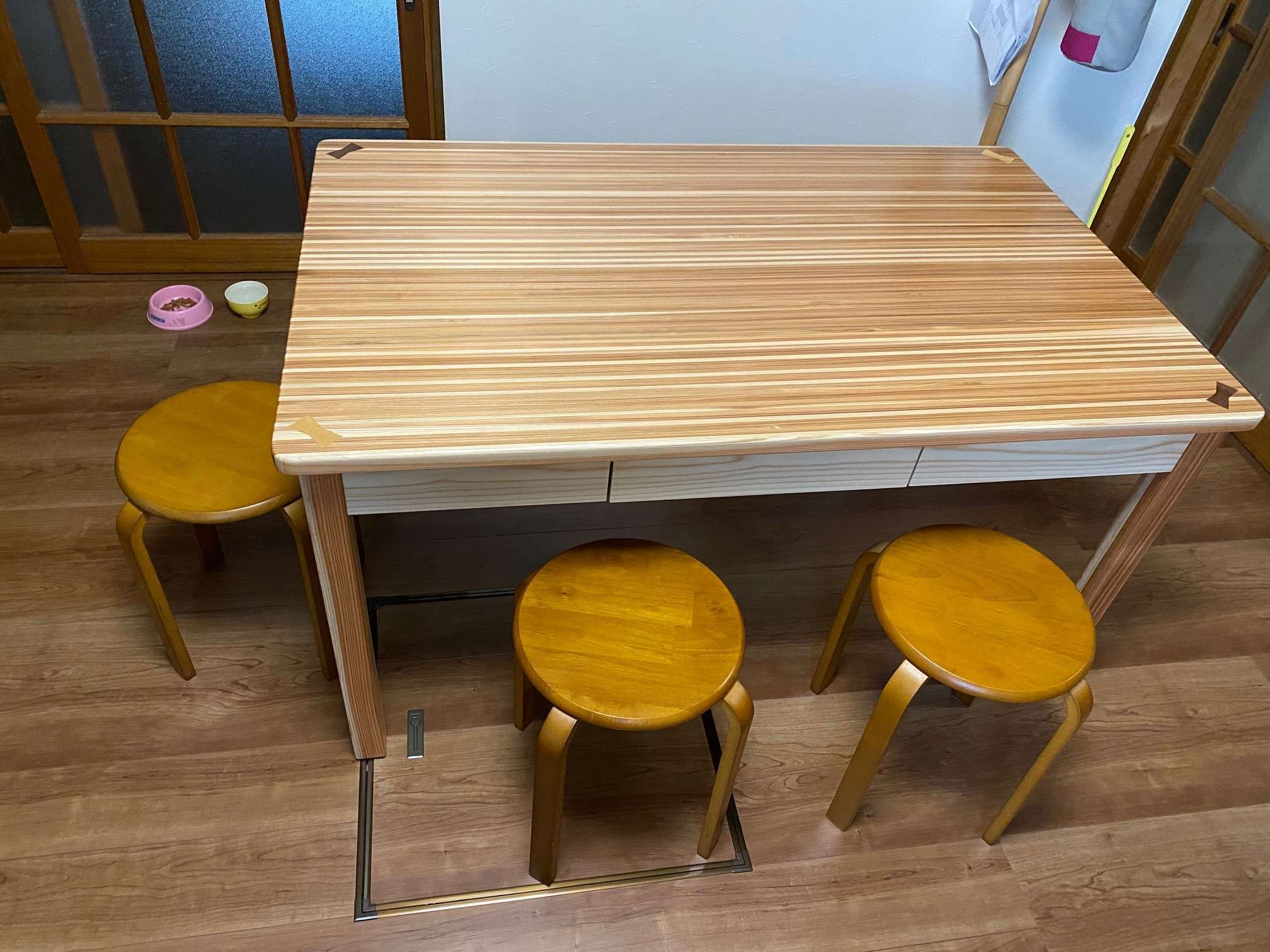 写真はダイニングキッチンの食卓テーブルです。素材は杉です。工場で製作時にどうしても木の端材ができてしまい少し集まったところでその廃材利用で製作致しました。成型していくのに小割作業等があり職人さんの手は多少かかりますが出来上がると結構立派なものになりました。いかがでしょうか?家庭の食卓に木の暖かみ感じるテーブル。またオリジナルならではの引出もつけてみました。いろいろと試してもみたいので他の事でもどうぞご相談ください。補強金具隠すのにアクセントで木で模様入れてあります。最後になりましたが、皆様にとってよい年でありますように・・・