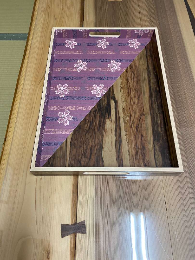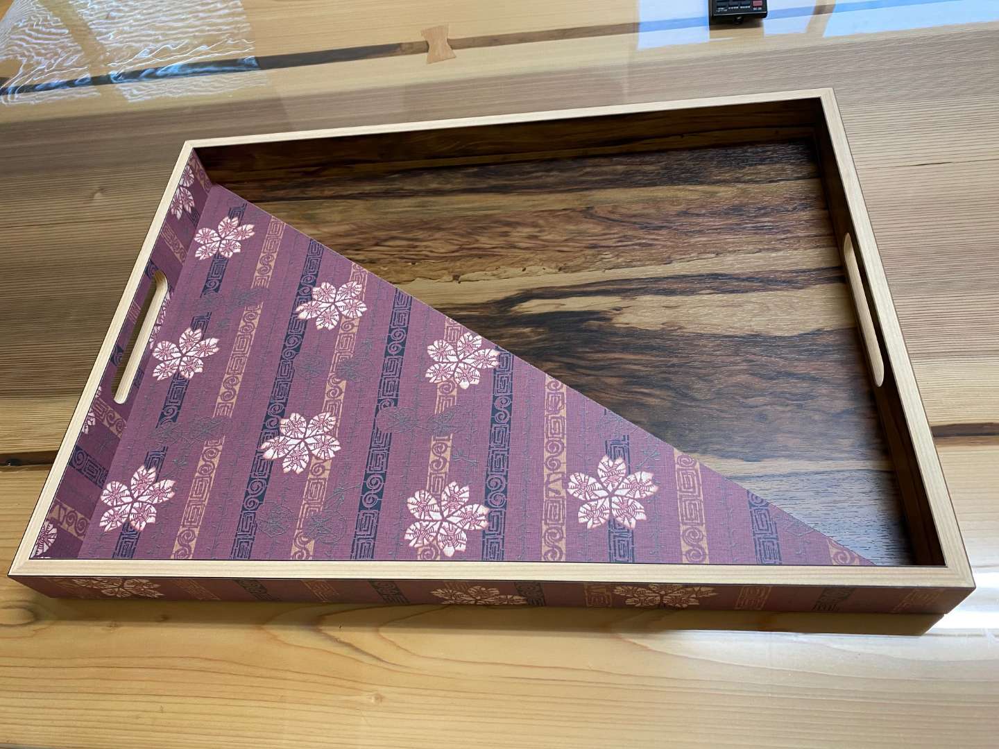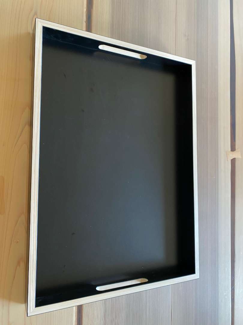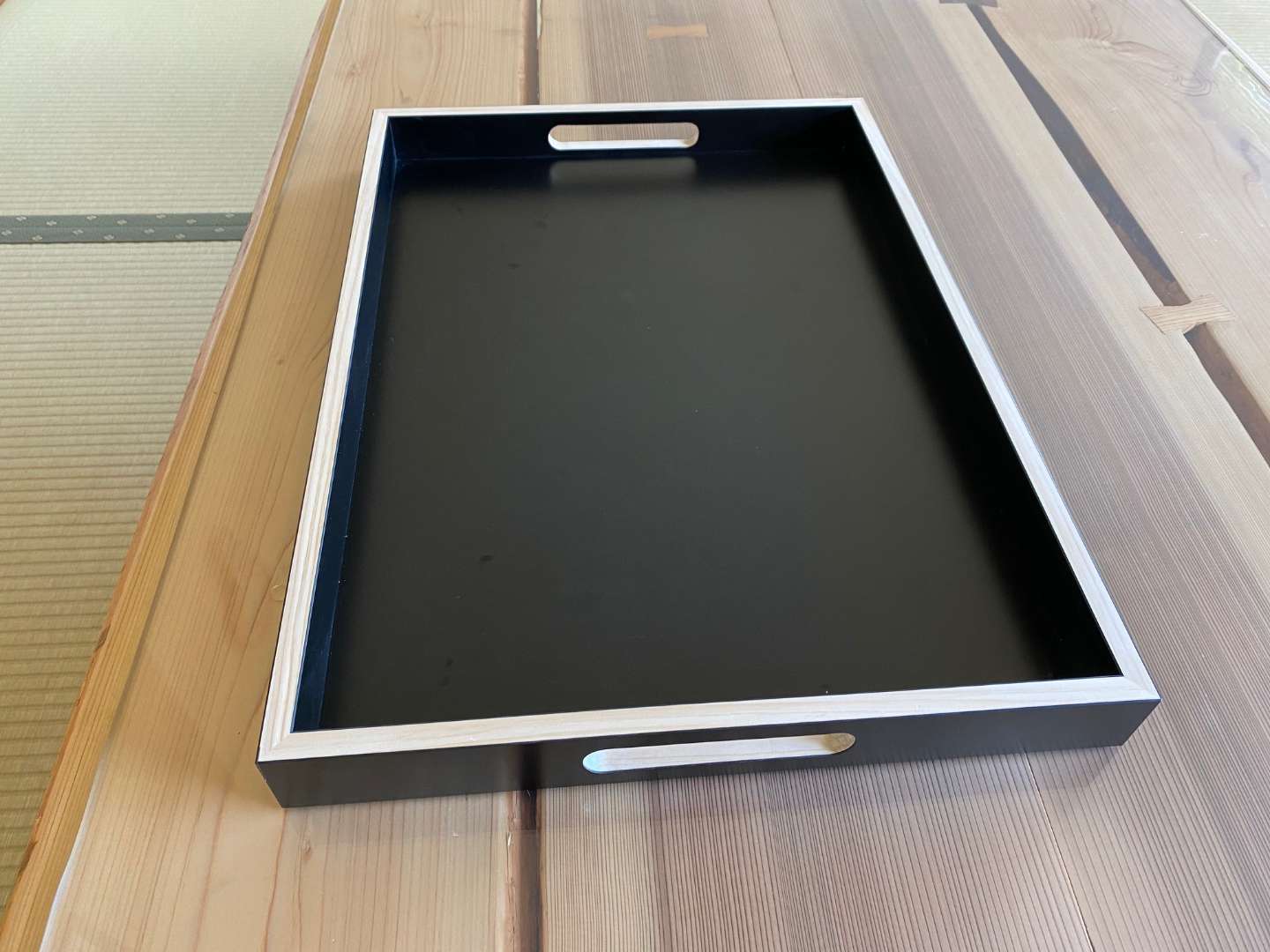 写真は食器やお料理を運ぶお盆です。素材はメラミン化粧板です。お食事処や接客の際に運搬用に利用する手頃なアイテムとしてよく使います。木製品で塗装品が多いですが表面素材を替えることでキズ等強くしてはどうかと製作してみました。黒色の表面材とフチドリの白木がスッキリした仕上げになりました。