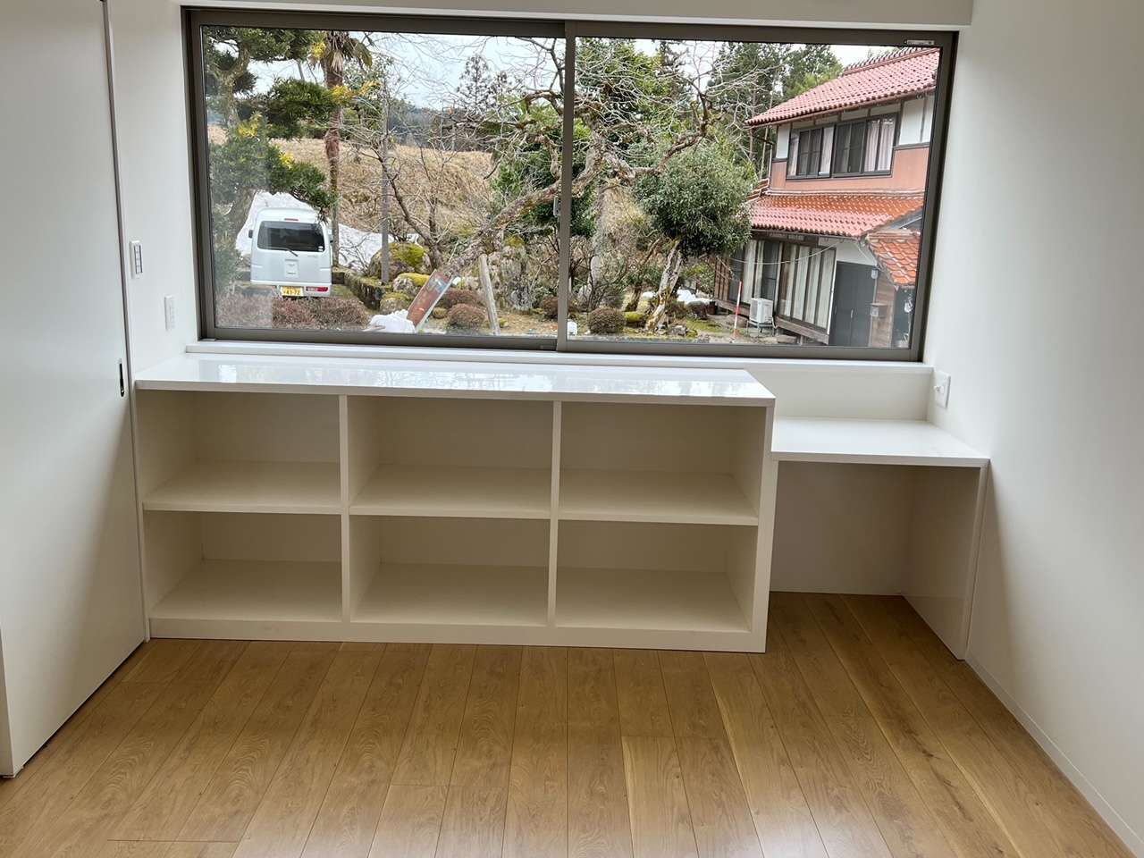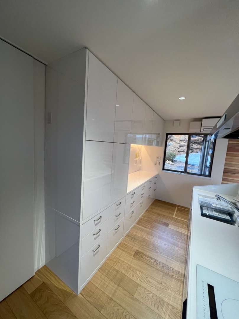 白い光沢のある化粧面材で仕上がっています。引出やオープン棚を取り入れた収納たっぷりの家具です。色統一や見た目もきれいに納まりました。