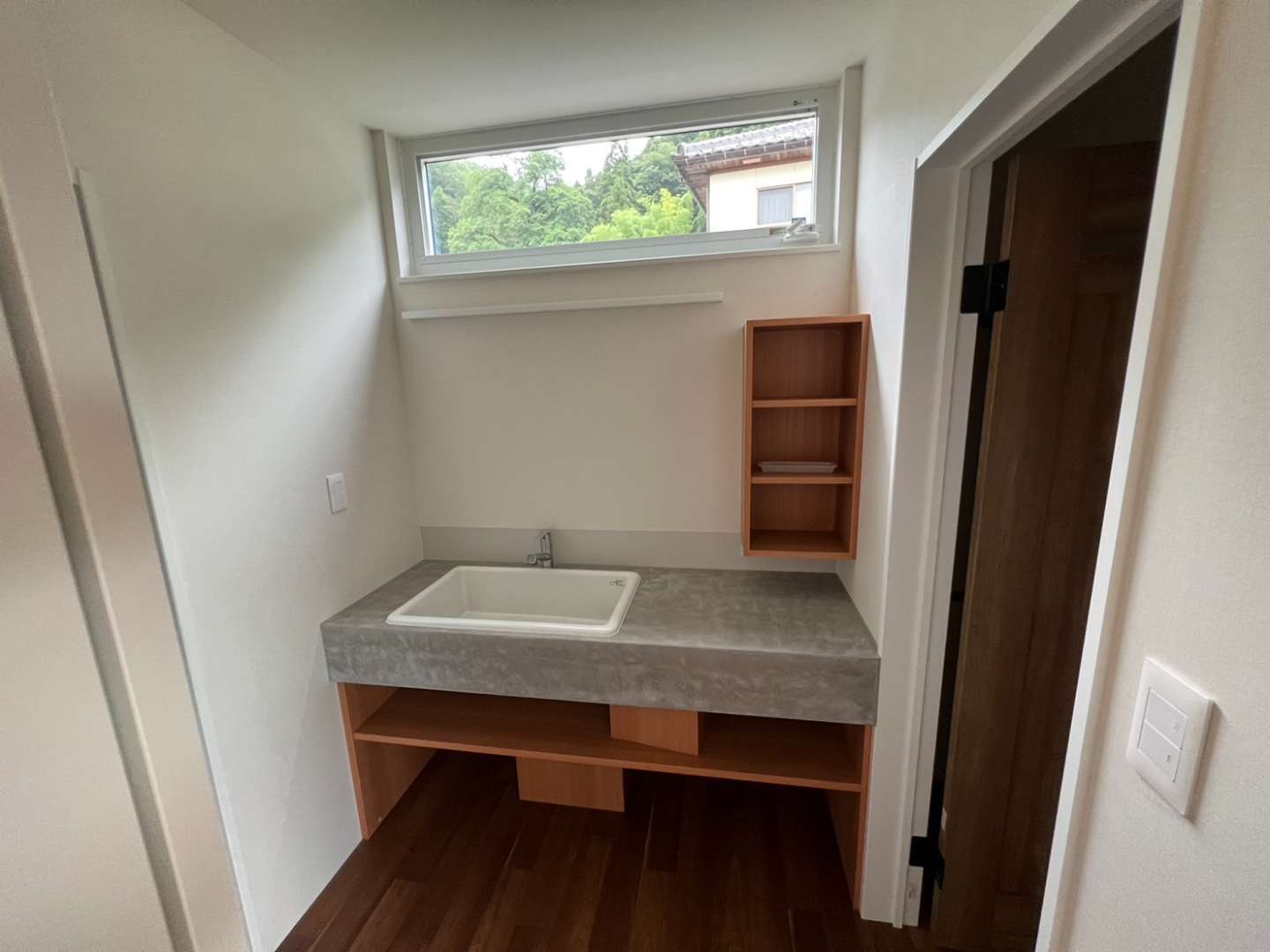 上段は洗面室で正面にミラー取付前ですがTOP仕上がモールテックスの洗面台今流行ってますよね。その下部にオープンの収納スペースを付けてます。ミラーが付く横にオープンの小物収納を設けて歯ブラシ等置けるようになってます。
