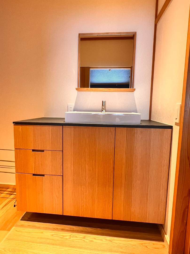 お次は、③~洗面台収納(TOPメラミン化粧板耐水OK、引出・扉は木目でスキッリ!)